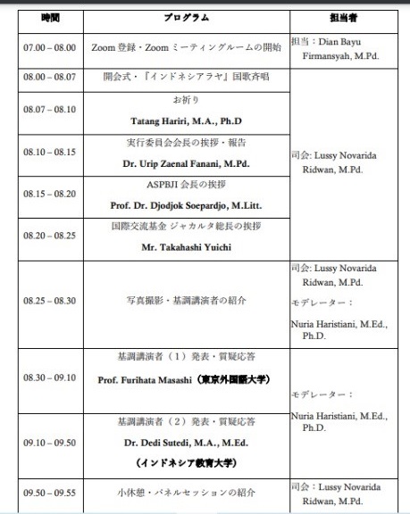 The Future of Challenge Japanese Education in Society 5.0」 です。前半は「基調講演」、後半は「分科会」と2部構成でした。今回その基調講演としまして、東京外国語大学のFurihata Masashi 氏, インドネシア教育大学の Dedi Sutedi 氏, ハンクラテッシュの Razaul Karim Faquire 氏、 及び日本の Tahara Yuka 氏の 先生方の基調講演を行いました。その他、 60 名の発表者と参加者 40 名が応援しており、本セミナーに参加しました。基調講演に Furihata Masashi氏の「インドネシア語とスンダ語の情報構造について」、Dedi Sutedi氏のProspek Pendidikan Bahasa Jepang di Indonesia pada Era