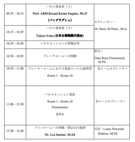 Society 5.0(ソサイエティ 5.0 におけるインドネシアの日本語教育の事情・展望}、ABM Razaul Karim Faquire氏の「グローバリゼーションとリングワ・フランカとしての日本語の位置づけ」、及び Tahara Yuka氏の「台湾における日本語教育事情」という順となっています。