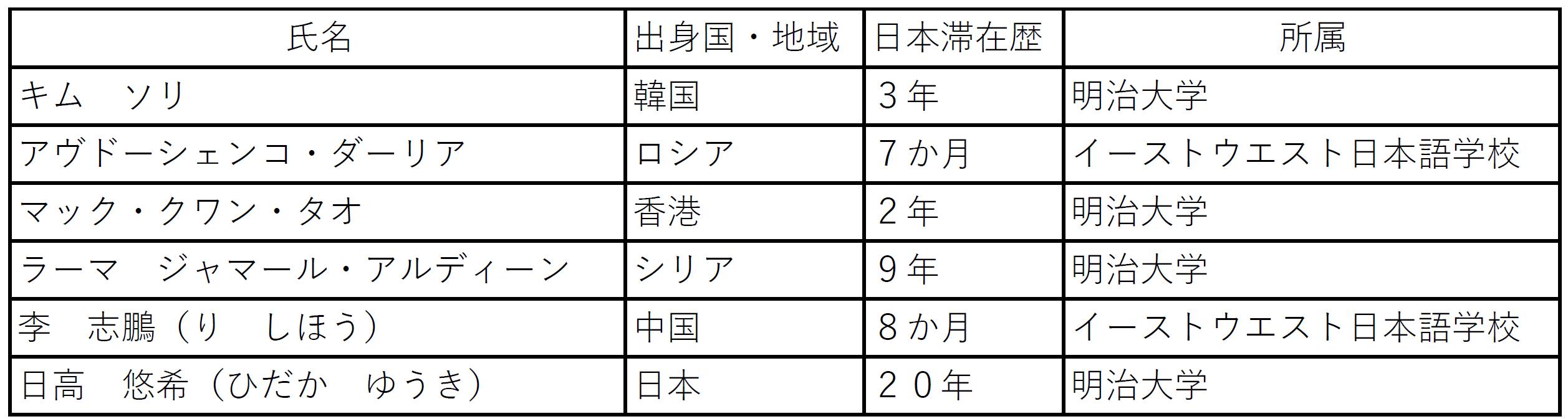 区長との懇談会での登壇者は、酒井区長と山脇教授、そして、以下の6人の学生さん達です。昨年は、登壇者もそれぞれZOOMによる参加でしたが、今年は登壇者は全員明治大学に集まり、参加者はZOOMで聴くというスタイルとなりました。今回のテーマは、以下のとおりです。