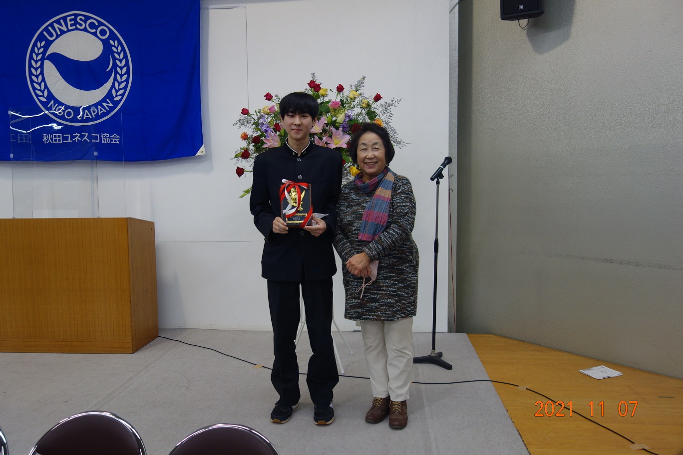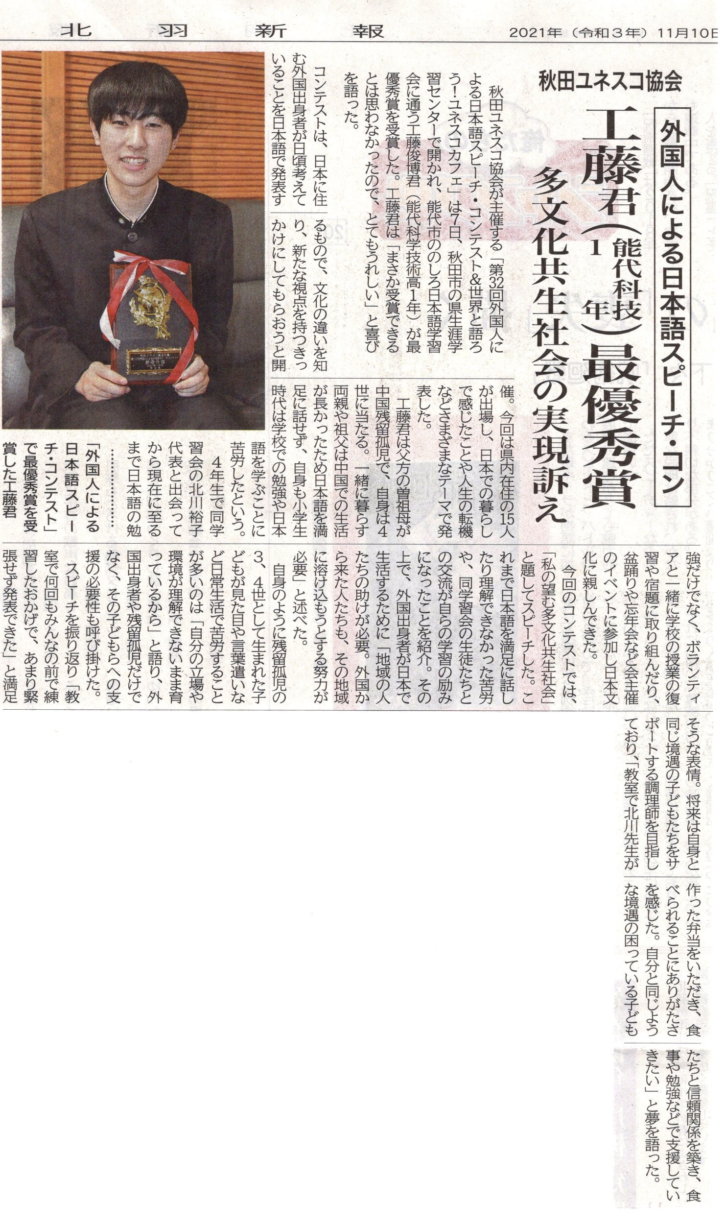 11月7日の日曜日に、秋田ユネスコ協会主催の「外国人による日本語スピーチコンテスト」が行われました。このスピコンには、能代市にある「のしろ日本語学習会」から毎年学習者が参加し、賞をもらっています。そのこ