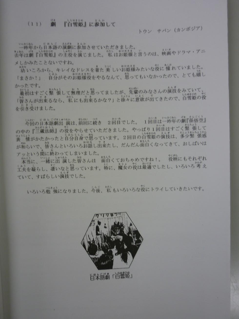 インターネットで見つけた、京劇「白骨精」のあらすじから、セリフの部分を抜き出し「西遊記」として上演。女性(?)の妖怪を男性が演じ、それ以来彼は、ドラマの虜に・・・出演者全員、長台詞をよく覚えて、支援者一同感動!