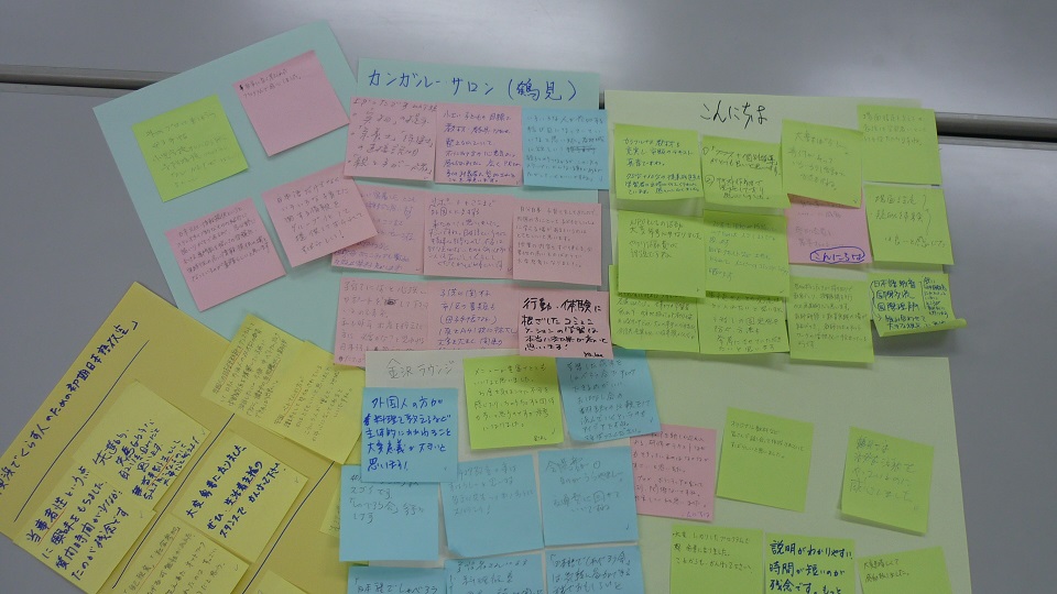 第2部のディスカッション・タイムでは、まずは発表者が「参加者との対話で気づいたこと・感じたこと」を語り、そのあとは、ファシリテーターから付箋紙に書かれたコメントを紹介していきました。さらには、金沢国際交流ラウンジが行った「学習者によるアンケート」の報告があり、いかに学習者のニーズ調査が重要か、支援者の思いとのズレなどについて気づかされました。参加者からたくさんの貴重なご意見、コメントをいただき、「ディスカッション・タイム」は有意義な時間となりました。ぜひご紹介したいところですが、ここでは参加団体についてのご紹介・コメントにとどめます。どうぞ主催団体である横浜市国際交流協会(YOKE)による報告をお楽しみに!(YOKE:http://www.yoke.or.jp/)。