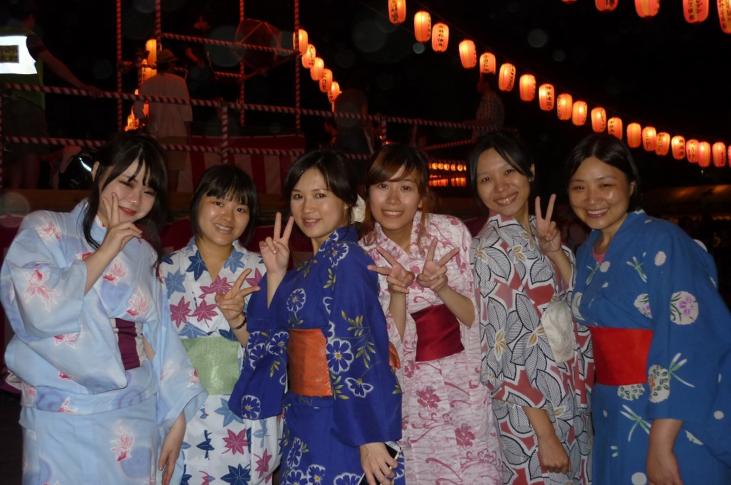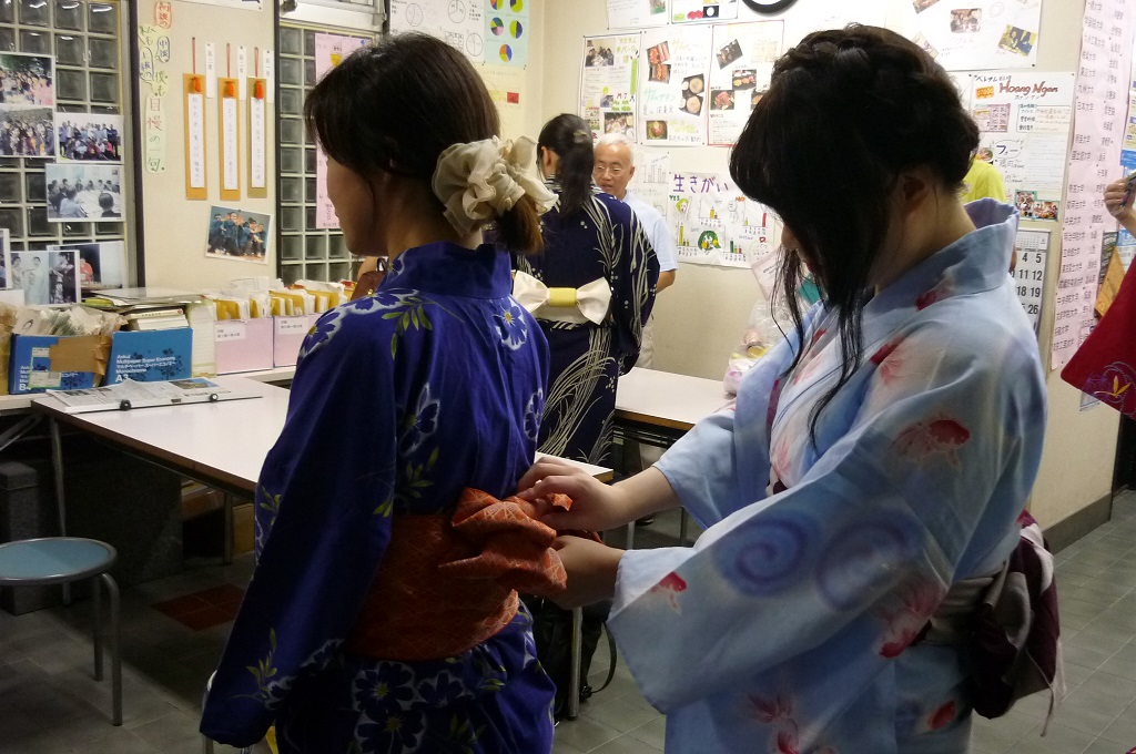 そして迎えた盆踊り当日、今年もいつも通り、授業が終わって6時から着付けが始まりました。先生方が手分けして、参加する学生さんに着せるのですが、今回は「授業見学・ビジターセッション」に参加した清泉女子大学の学生さんも着付けから手伝ってくれました。こうして、一つの交流活動が、さらに次の活動へとつながり、それが継続されていくことがとても重要なのだと思います。