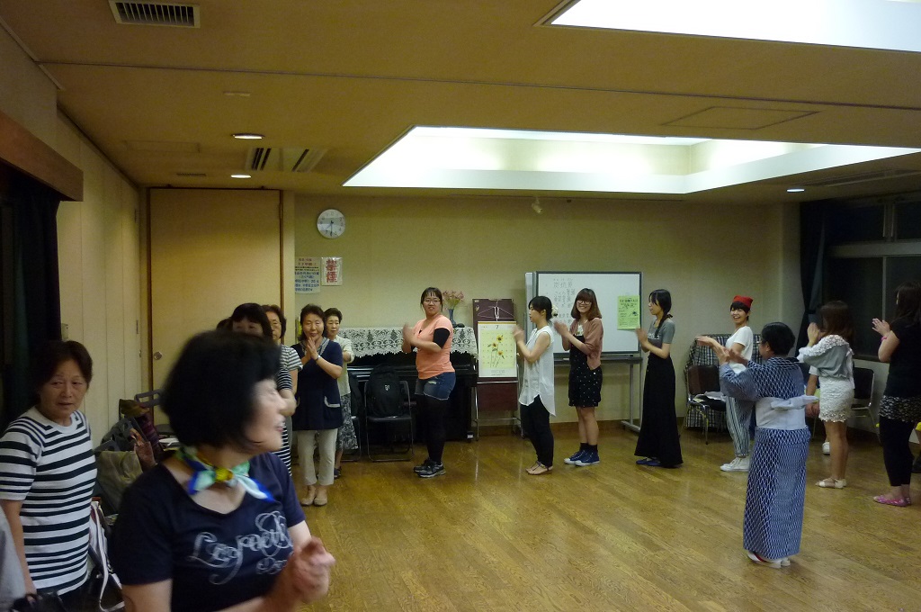 単にイベントに参加するのではなく、地域の公民館での事前練習にも参加し、地元の皆さんと触れ合い、本番盆踊りに臨みます。この練習会には近所のお子さんも参加し、いろいろな人といっしょにワイワイ言いながら、踊りの先生に手取り足取り教えていただきます。