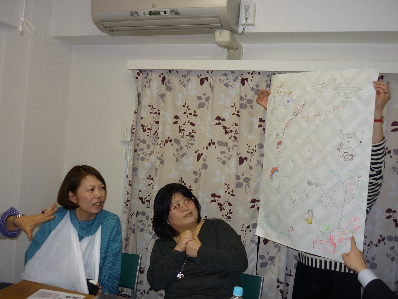次は「大きな紙を用いた連想ゲーム」です。5人1組のグループになり、順番に絵を描いていきます。ルールは①使用言語は英語またはほかの言語 ②すでに描かれているものを見て、何を描くか考えていく ③どこに描くは自由、折り紙や切り絵を使ってもよいので立体作品も可能 ④アイデアや言葉に困ったときは「ヘルプカード」を使うのも可、でした。最終目標は“みんなでひとつの絵を完成すること”と説明がありました。っとここで参加者から質問です。