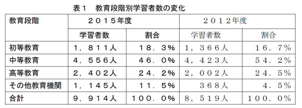 国際交流基金の日本語教育機関調査の結果を、2015年と2012年で比べてみると、ある特徴がみられます。