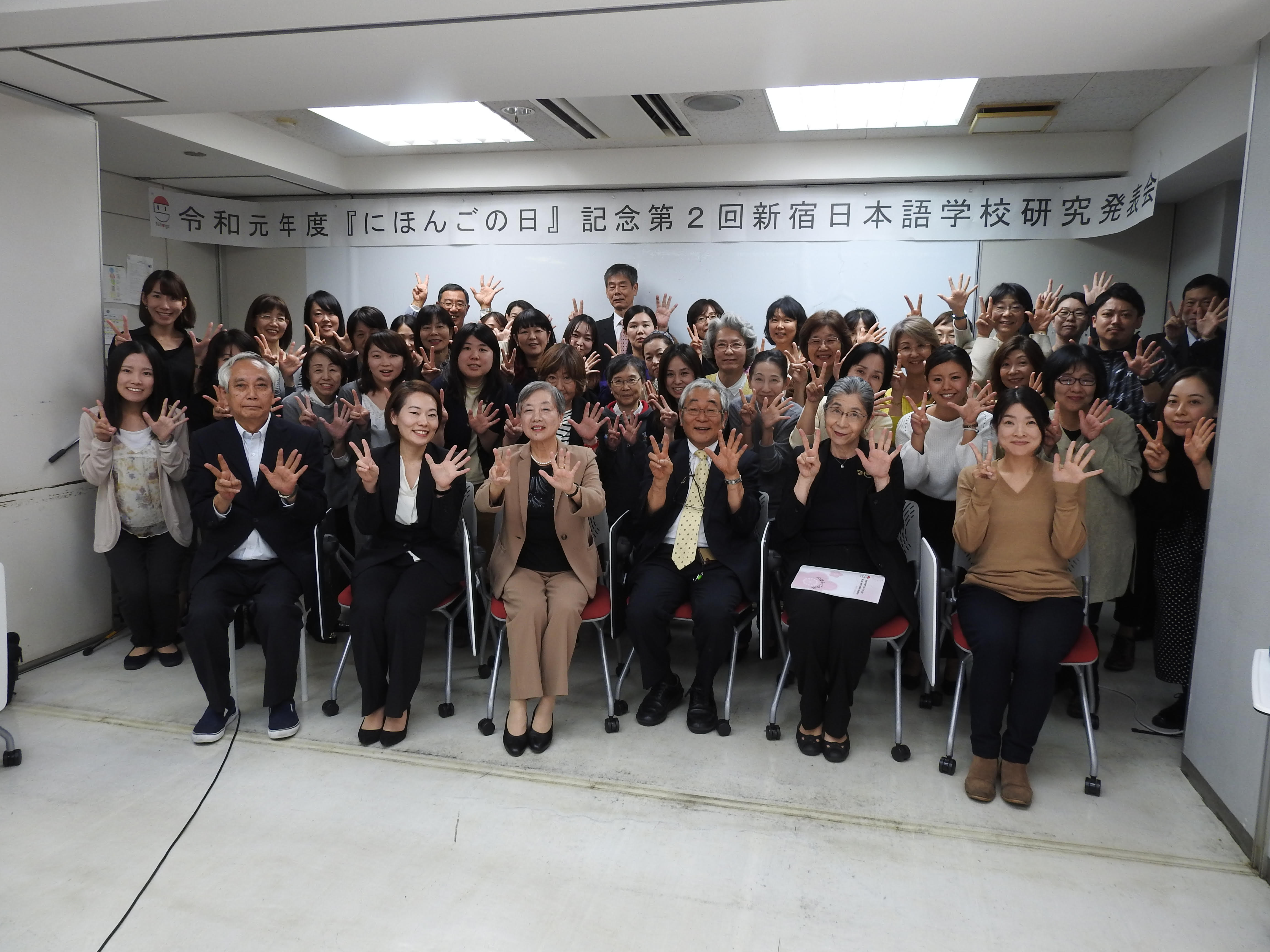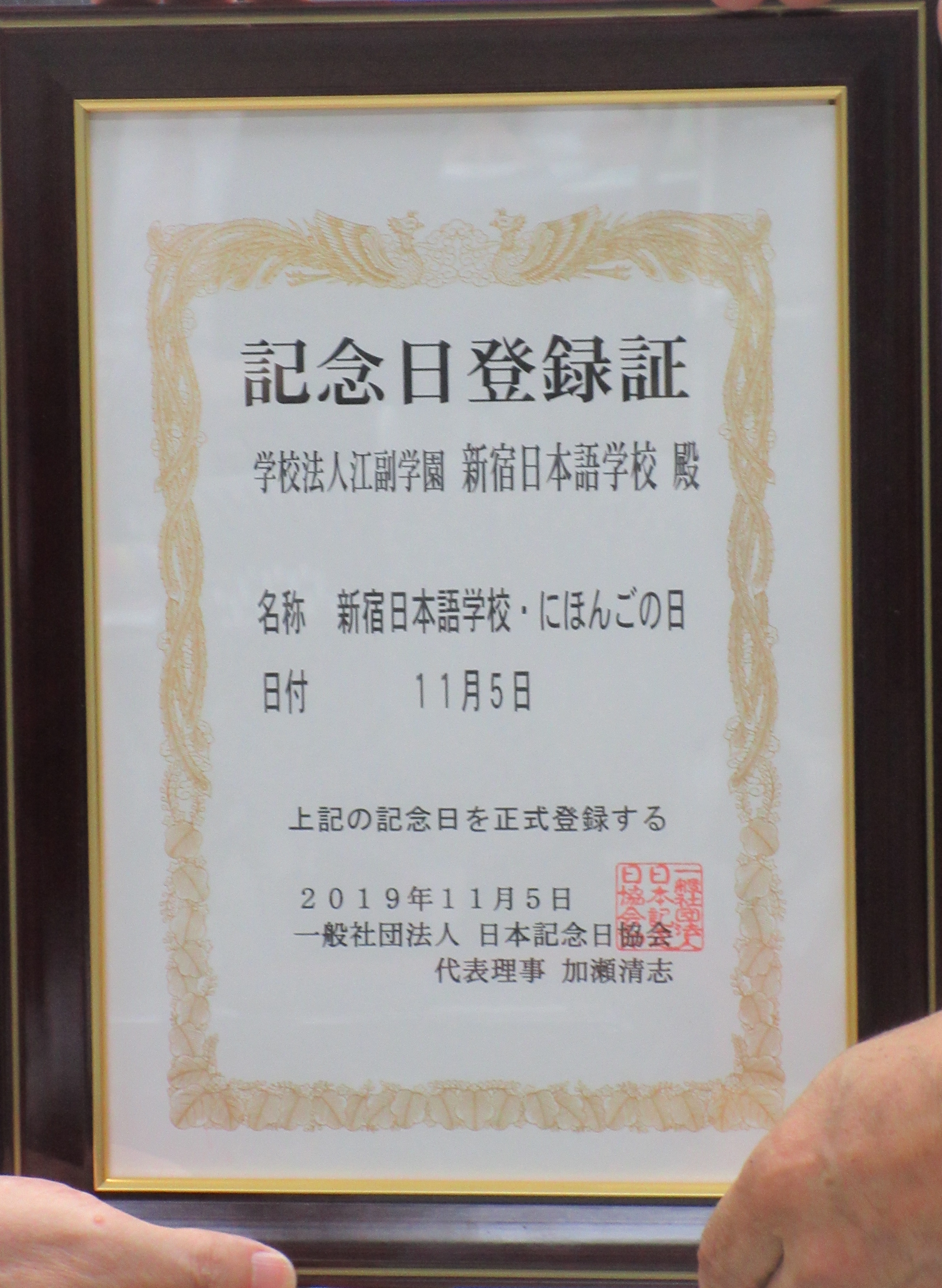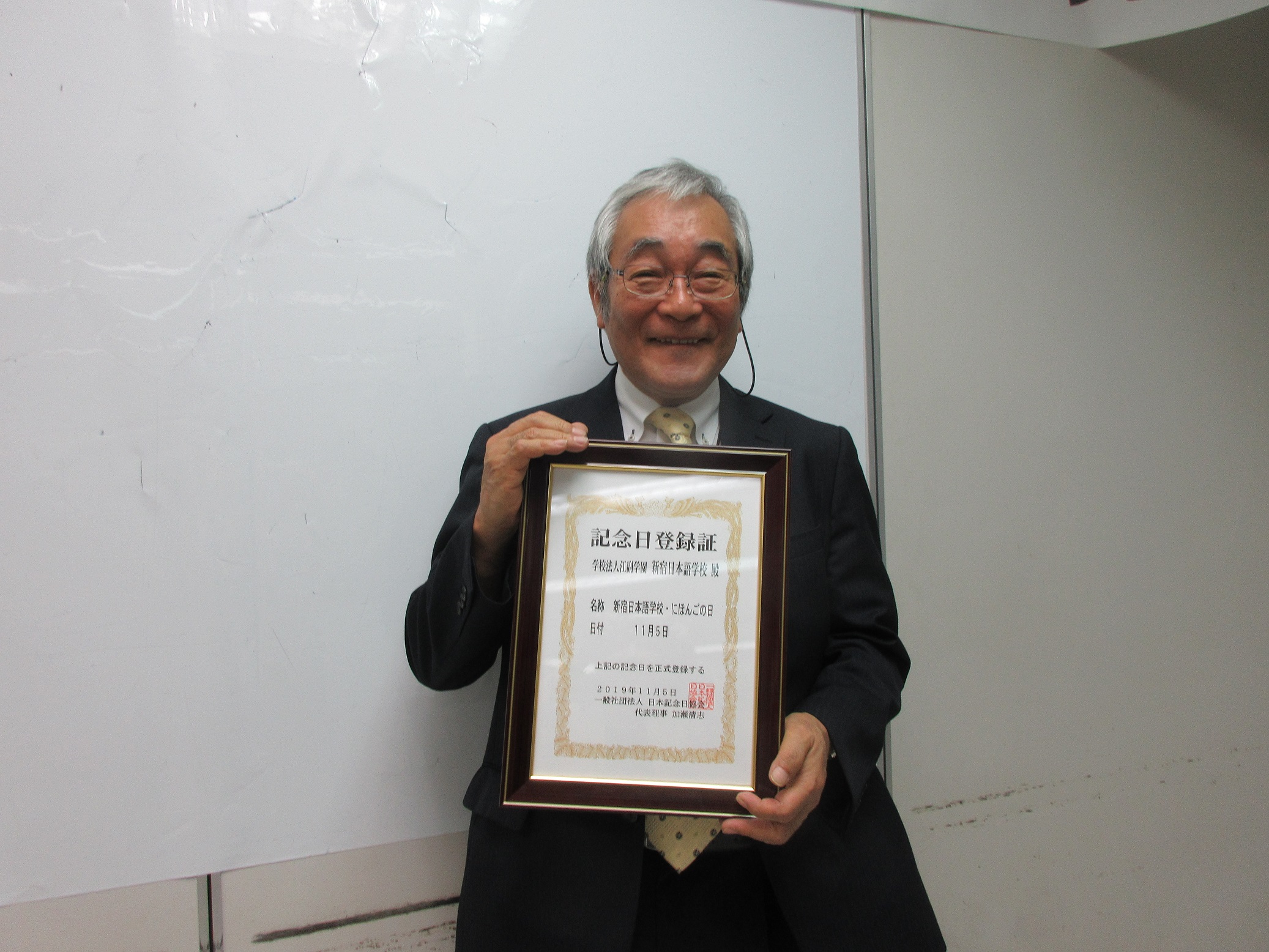 そして、去年「学内研究発表会」を発足させるにあたって、「にほんごの日」を制定し、「第1回『にほんごの日』記念 新宿日本語学校研究発表会」としました(実際には、学校のスケジュールの都合で、11月3日実施となりましたが・・・)。今年の第2回学内研究発表会は、もちろん11月5日に実施、さらに、登録申請をすることとし、当日「記念日登録授与式」と相成りました。なぜ11月5日が「日本語の日」になるかというと、「11」という数字は、「〈1〉が2本」、「5」は「語」なので、「にほんご(日本語)」となります。
