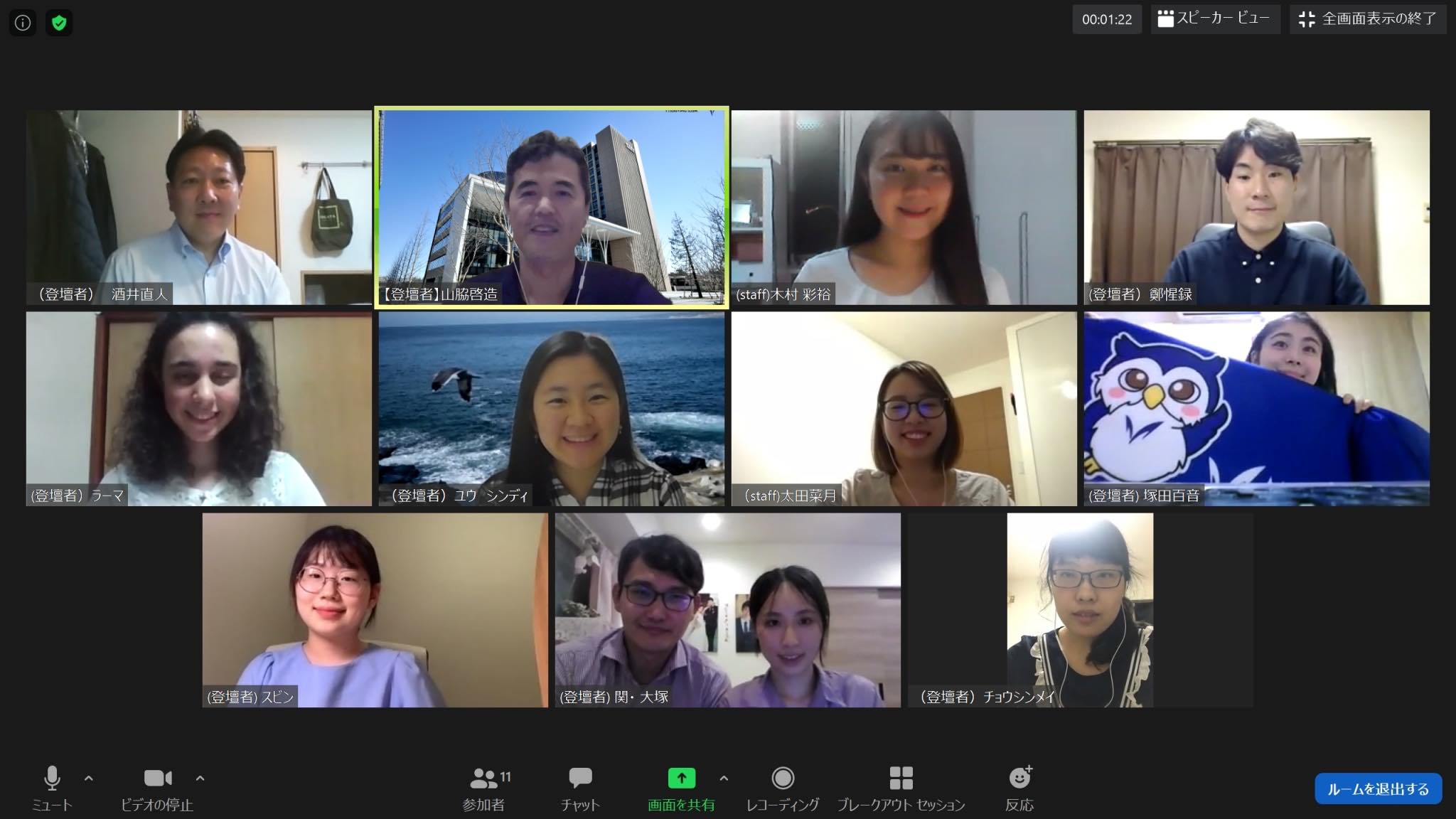 区長との懇談会に参加する外国人住民は、韓国2名、中国2名、米国1名、シリア1名の6名、それに日本人住民を加えた2名、そして酒井区長とモデレーターの山脇教授の10名で懇談会は進められました(イーストウエスト日本語学校からは、中国出身のチョウ・シンメイさんと、韓国出身のウ・スビンさんの2名の留学生が参加しました)。参加者は、山脇ゼミ生も加えると、総勢90人でのZOOM懇談会となりました。